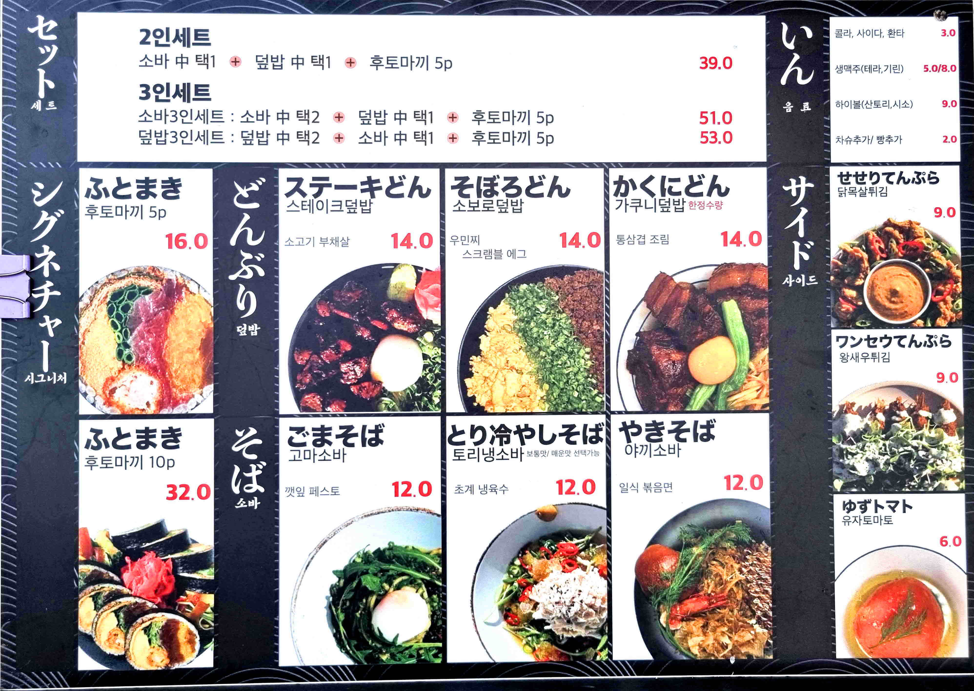 | ▷ 스테이크덮밥 ............. 14,000 ▷ 소보로덮밥 ................ 14,000 ▷ 가쿠니덮밥 ................ 14,000 ▷ 고마소바 .................... 12,000 ▷ 토리냉소바 ................ 12,000 ▷ 야끼소바 .................... 12,000 ▶ 후토마끼 5pcs........... 16,000 |