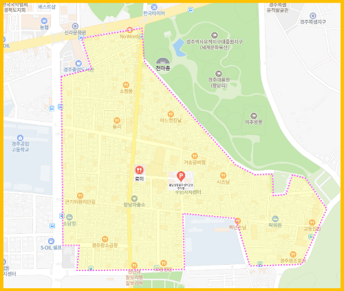 위 지도를 보면 핑크색 점선이 황리단길 외곽을 표시한 것인데 료미는 황리단길 한가운데 위치하고 있습니다. 황리단길 전체가 주차가 쉽지는 않으니 차를 가지고 방문하실 계획이면 골목 주차를 각오하셔야 합니다. 료미와 약 150m 떨어진 곳에 황남생활문화센터공영주차장이 있기는 하지만 황리단길이 인기가 많다 보니 금방 만차가 됩니다.