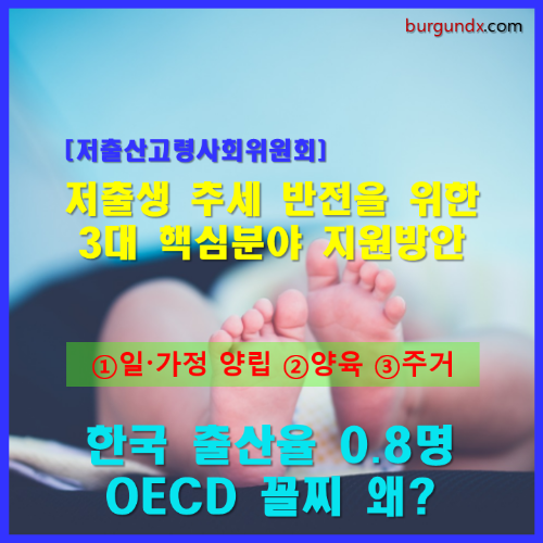 윤석열대통령을 위원장으로 하고 있는 저출산고령사회위원회는 현재 OECD 국가 중 출산율 꼴찌를 기록하고 있는 저출산 추세 반전을 위한 3대 핵심분야를 규정하고 총력지원 방안을 발표하였습니다.