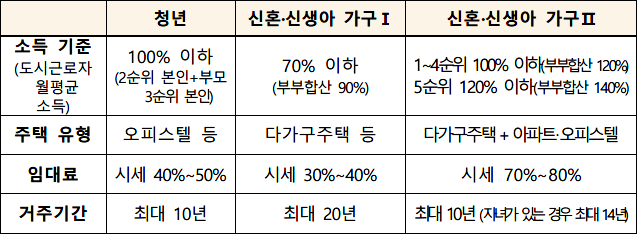 주로 미혼청년, 신혼부부, 신생아 가구 등으로 하고 있으며, 생활비에서 가장 큰 비중을 차지하고 있는 주거비 문제를 정부가 일정 부분을 지원해 주어 그 부담률을 낮추는 정책입니다.