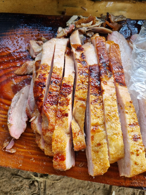 돼지 바비큐는 드럼통에서 훈제로 1차 조리 후 식당에 가져와서 돌판에서 직화로 조리합니다.