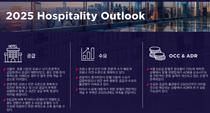 ③이러한, 시장 여건을 바탕으로 2025년에는 서울 내 3-4성급 호텔의 소폭 증가와 함께 활발한 거래도 예상된다.
