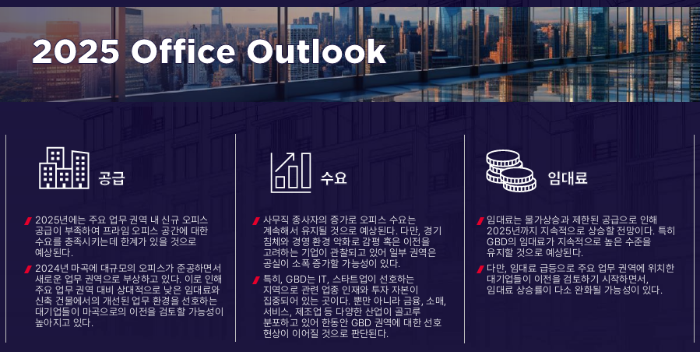 2025년에는 SI, 자산 유동화 거래, 밸류 애드를 위한 투자 등 A급 이상의 오피스와 중규모 이상의 본사 건물 거래가 계속해서 이어질 것으로 예상된다.