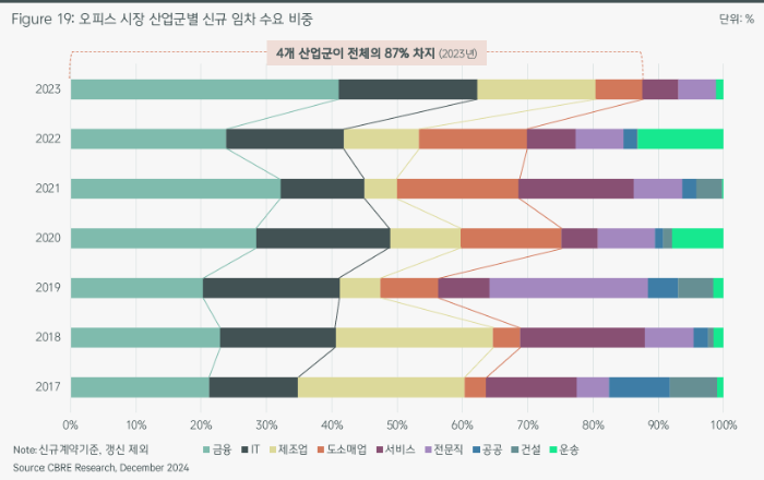 ①금융 산업의 안정적인 성장으로 오피스 공간의 지속적 수요 창출로 상위 4개 산업군(금융, IT, 제조업, 도소매업)의 87% 임차수요 차지.
