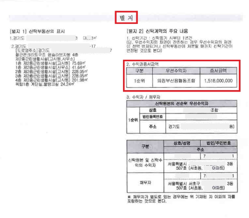 신탁원부 뒤편에 보면 <별지> 형태로 등기부등본에 표시되어 있지 않은 대출금액이 아래와 같이 표시되어 있습니다.