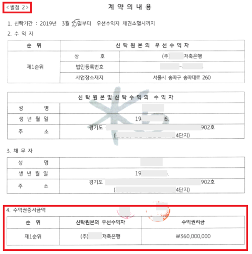 이는 등기소에 방문하여 신탁원부를 직접 받아 그 내용을 확인해 보면, 대부분 '우선수익자' 위탁자에게 대출을 해준 내용이 있습니다.