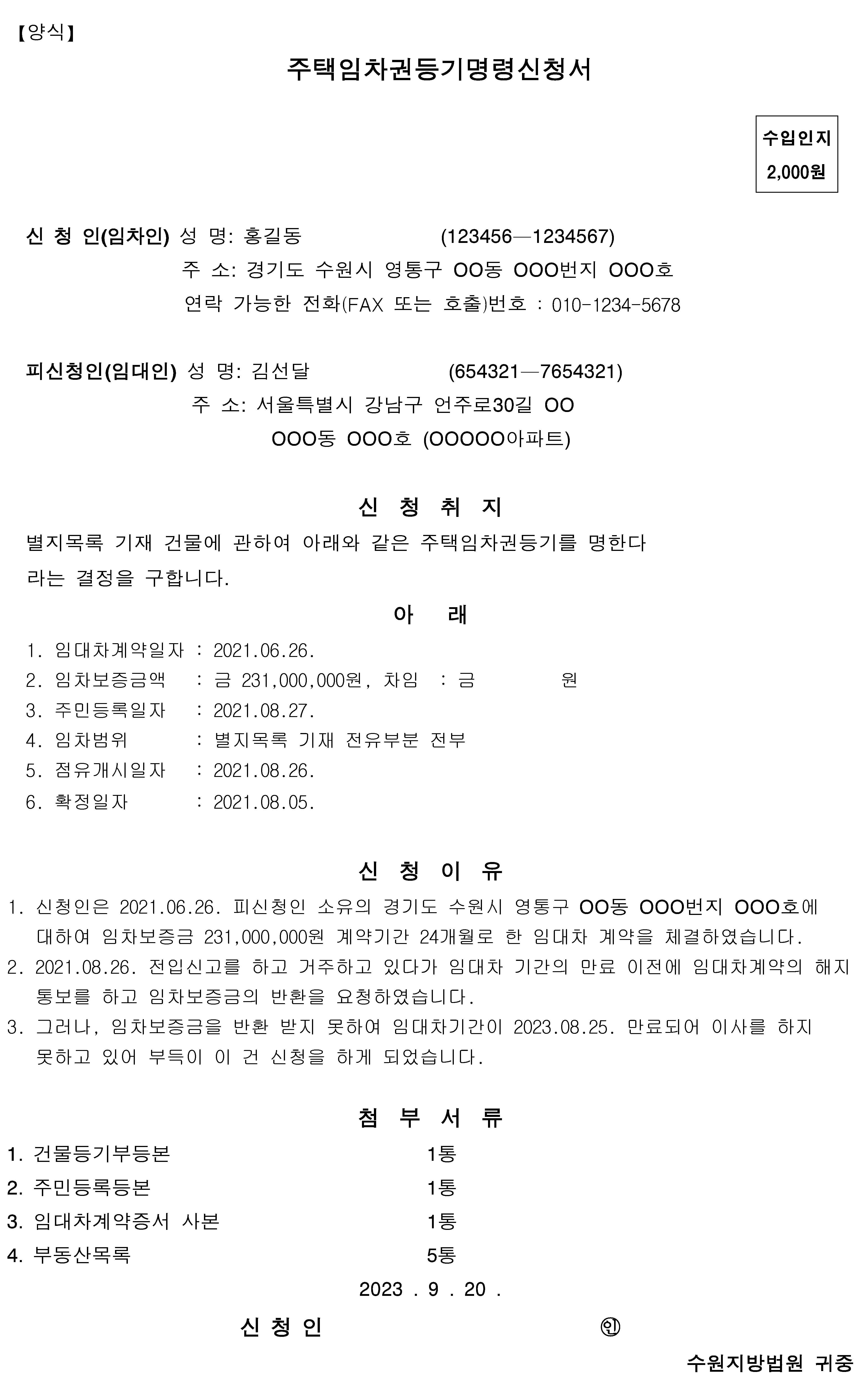 | 1. 주택임차권등기명령신청서 2. 부동산 목록 (별지) |