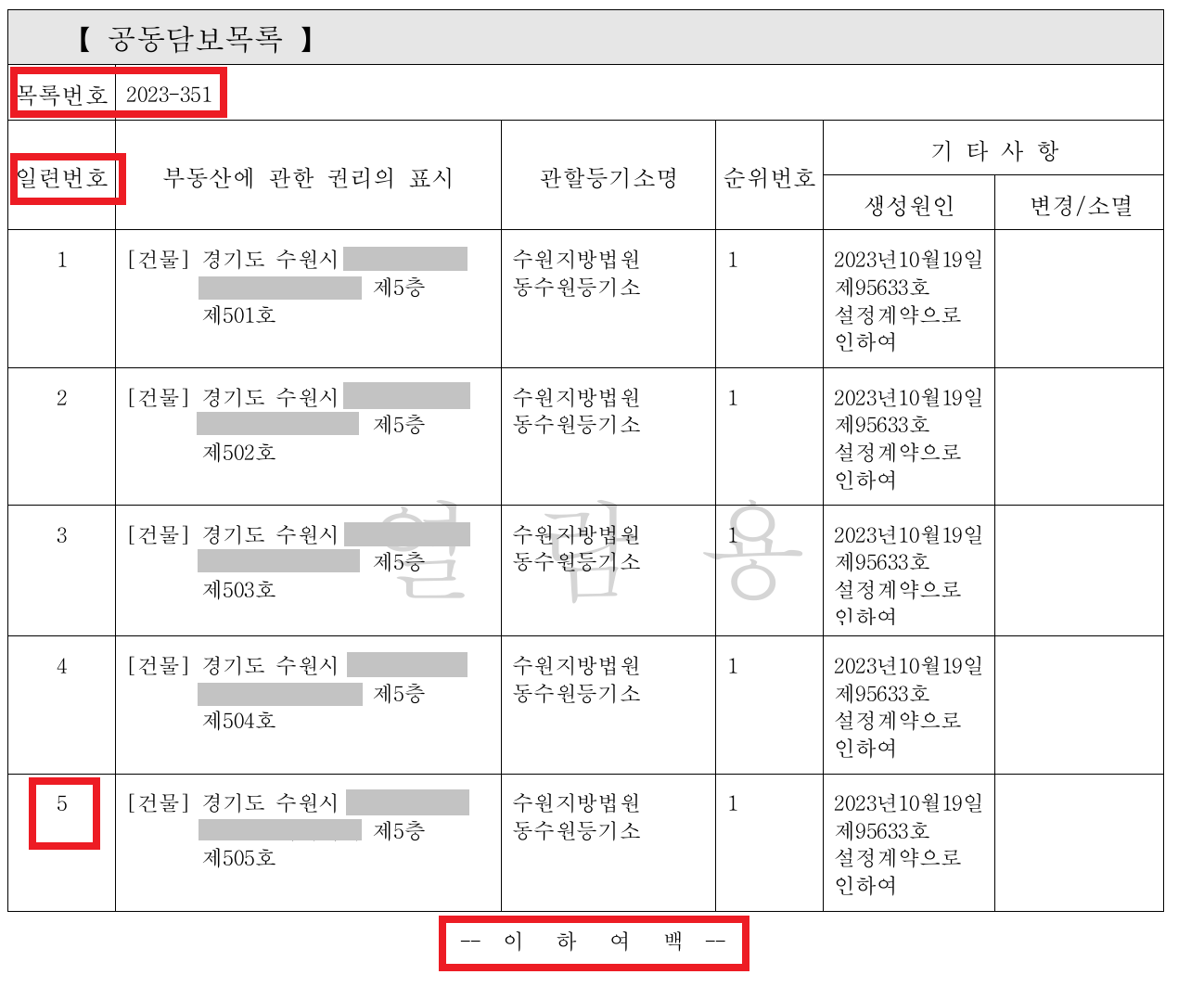 건축물대장에서 건물의 총세대수를 확인했을 때는 20세대였으니까 주거시설 전체에 대해서 공동담보를 제공하고 근저당권을 설정했다면 목록의 일련번호는 20번까지 있어야 합니다.