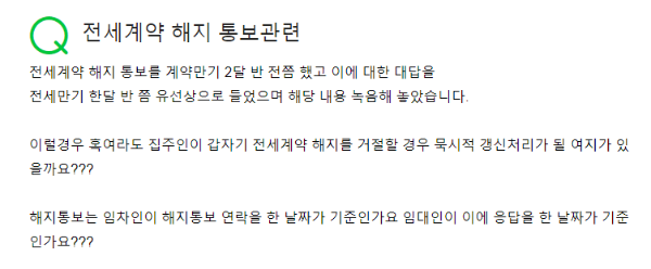 임차인의 계약해지통지 자체만으로는 계약해지 효력이 발생하지 않으며, 계약해지 통지에 대한 임대인의 답변이 계약만기 2개월 전에 있어야 계약해지통보에 대한 효력이 발생하며 묵시적갱신이 되지 않습니다.